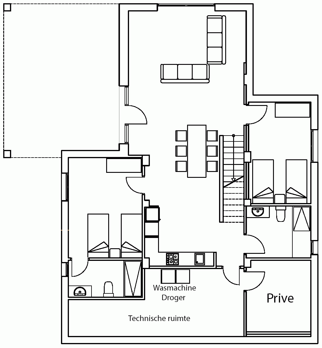 De begane grond van het huis is begin 2026 helemaal vernieuwd. Hier bevindt zich een ruime woonkamer en een volledig ingerichte keuken. Tevens zijn er hier twee slaapkamers met per kamer 2 losse bedden (ook aan elkaar te schuiven) en twee moderne badkamers met inloopdouche. Via de entree loopt u direct de ruime tuin in.