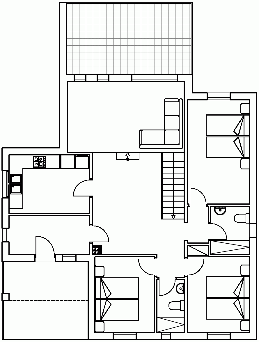 Op de eerste etage bevindt zich het originele woonhuis. Ook hier vindt u een ruime keuken, drie slaapkamers waarvan twee met twee losse bedden en één kamer met een tweepersoons bed en twee badkamers waarvan één met een ligbad.